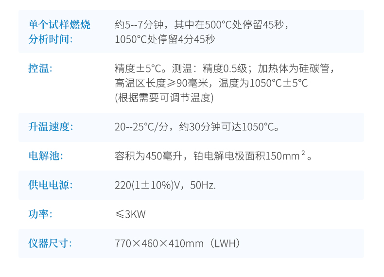 2.單個(gè)試樣燃燒分析時(shí)間:約5--7分鐘,其中在500℃處停留45秒,1050℃處停留4分45秒。