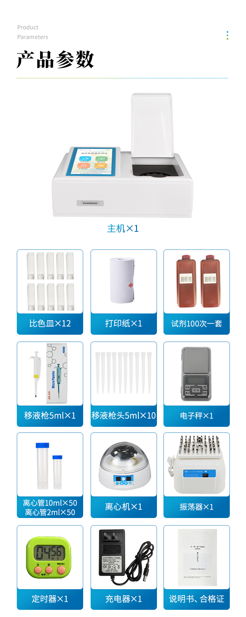 1、產品組成:主機、樣品前處理器件及測鮮劑;