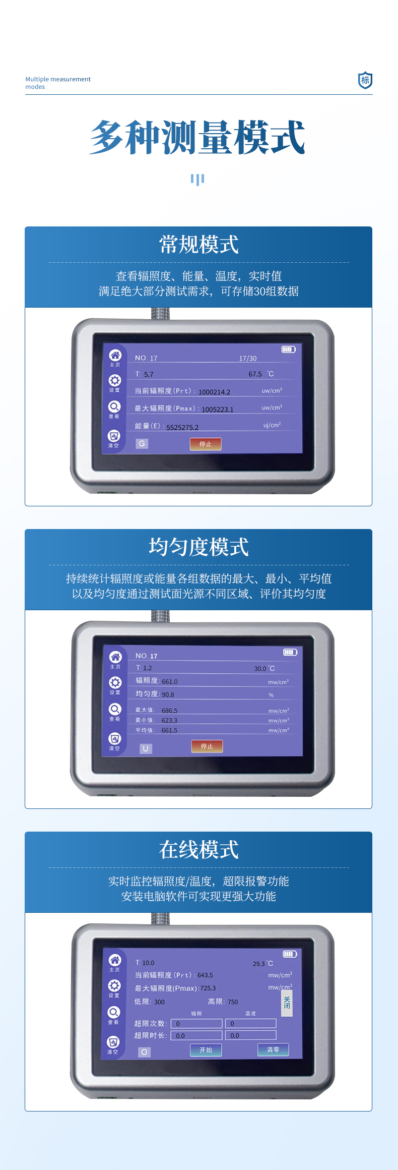| 功率單位: | uw/cm2、mw/cm2、w/cm2、w/m2(可自動/手動切換) |