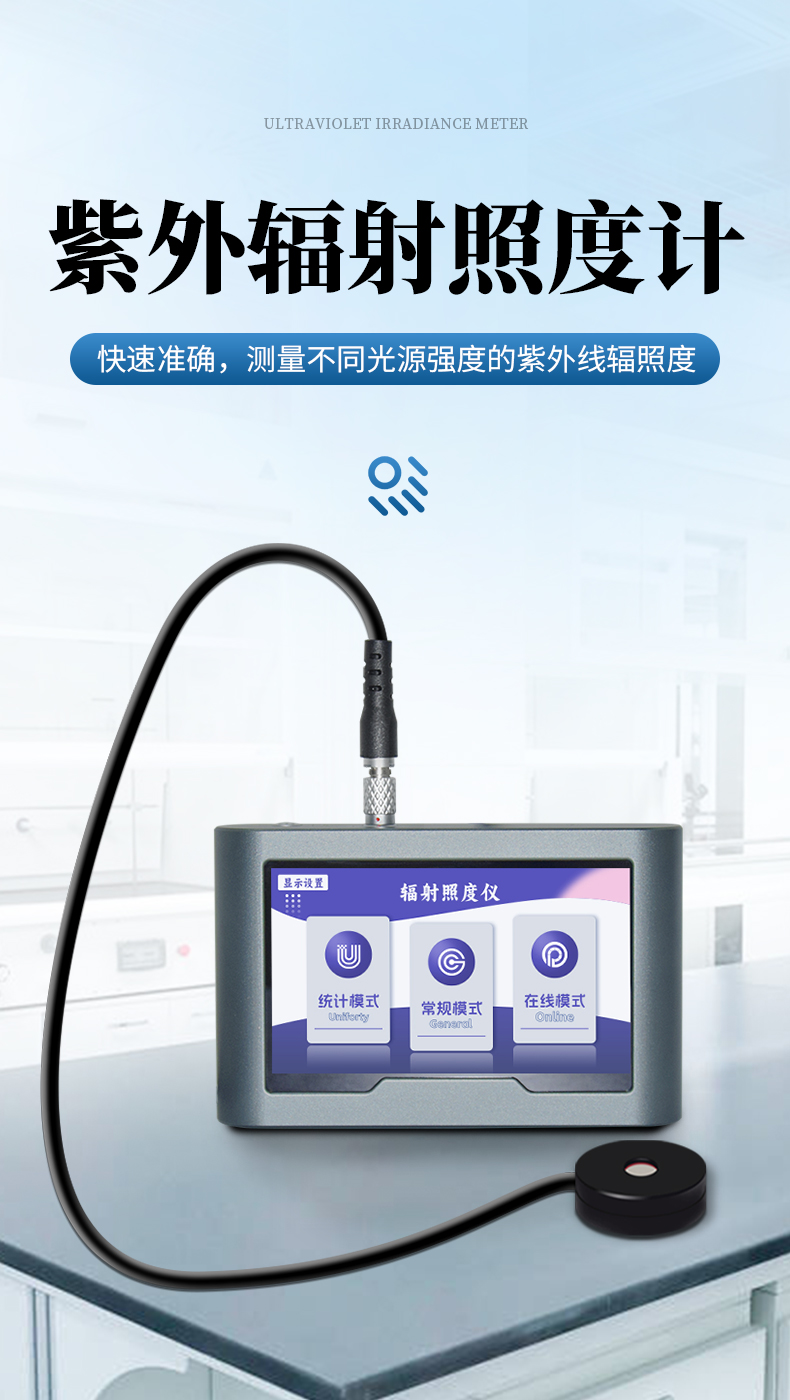 讀取,精度更高;測量模式可切換,可實時監(jiān)控;可通過測試面光源不同區(qū)域、評價其均勻度;量程可自動識別切換,真正實現(xiàn)從弱光到強光一機式測試,儀器操作更加簡單快捷。快速、準確地測量出不同光源強度下的光固化、光刻、光照治療、殺菌消毒、理療熒光分析、植物栽培、水處理、氣象和農(nóng)業(yè)生產(chǎn)紫外線光源等各行業(yè)的紫外線輻照度。