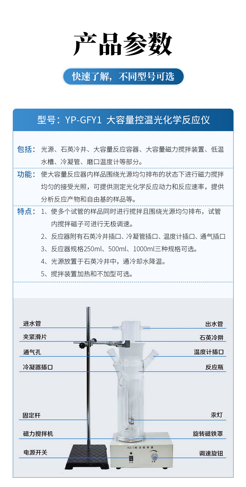 | 多試管+大容量反應器 | 包括:光源、石英冷井、石英試管、濾光裝置、多試管攪拌裝置、大容量反應器、低溫水槽等部分。 功能:使試管內樣品圍繞光源均勻排布的狀態下進行磁力攪拌均勻的接受光照,可提供測定光化學反應動力常數、量子產率等 特點:1、使多個試管的樣品同時進行攪拌且圍繞光源均勻排布,試管內攪拌磁子可進行無極調速,可連接氣相色譜儀。 2、光源放置于石英冷井中,通冷卻水降溫。 3、石英試管內放置光照溶液,30ml或50ml可選 |
