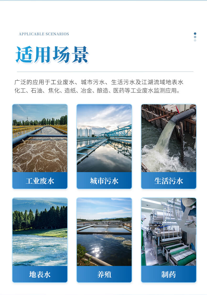 能夠廣泛的應用于各種行業(工業廢水、城市污水、生活污水及江湖流域地表水)廢水的檢測,可適合不同用戶的多種需求,可在化工、石油、焦化、造紙、冶金、釀造、醫藥等工業廢水及各種生活污水監測應用。