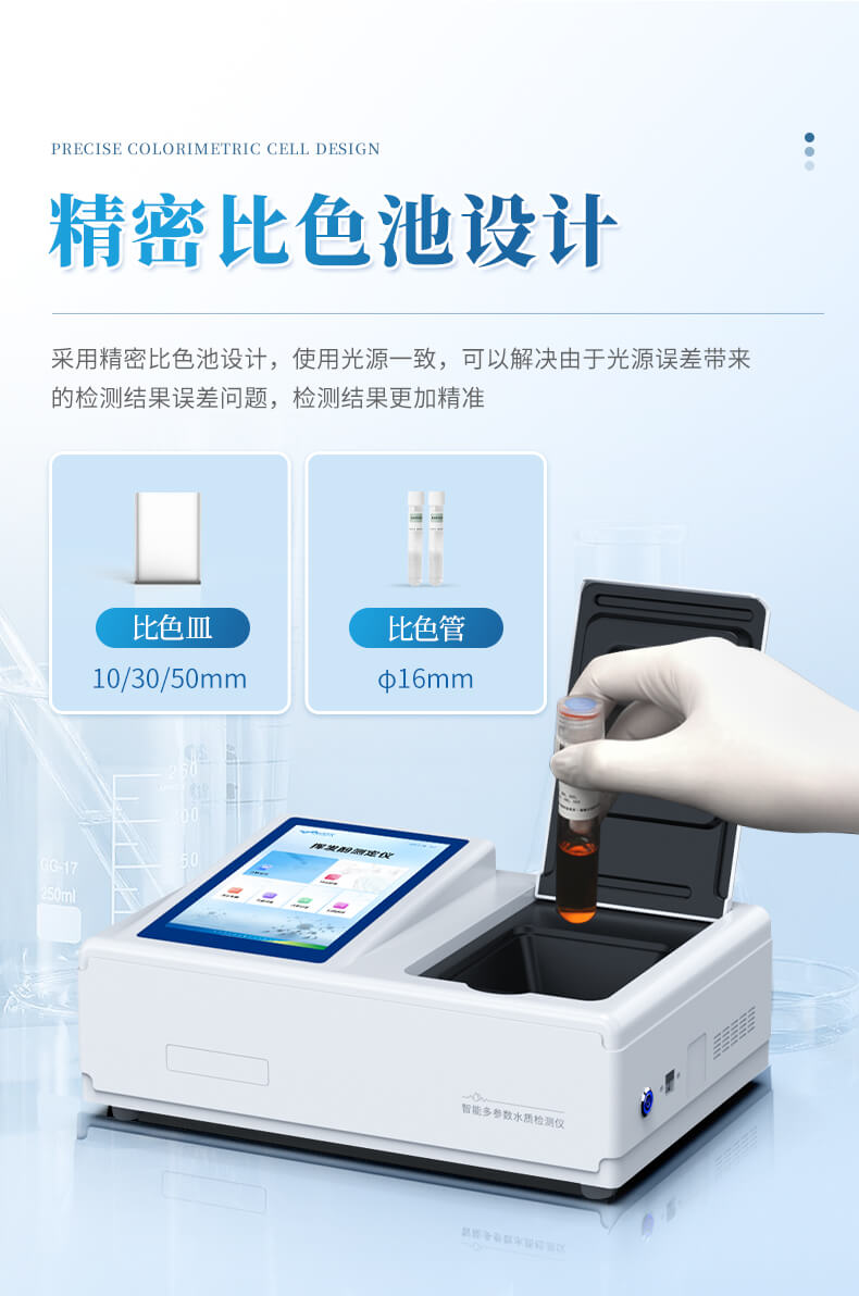 3、采用精密比色池設計,使用光源一致,可以解決由于光源誤差帶來的檢測結果誤差問題,檢測結果更加精準。