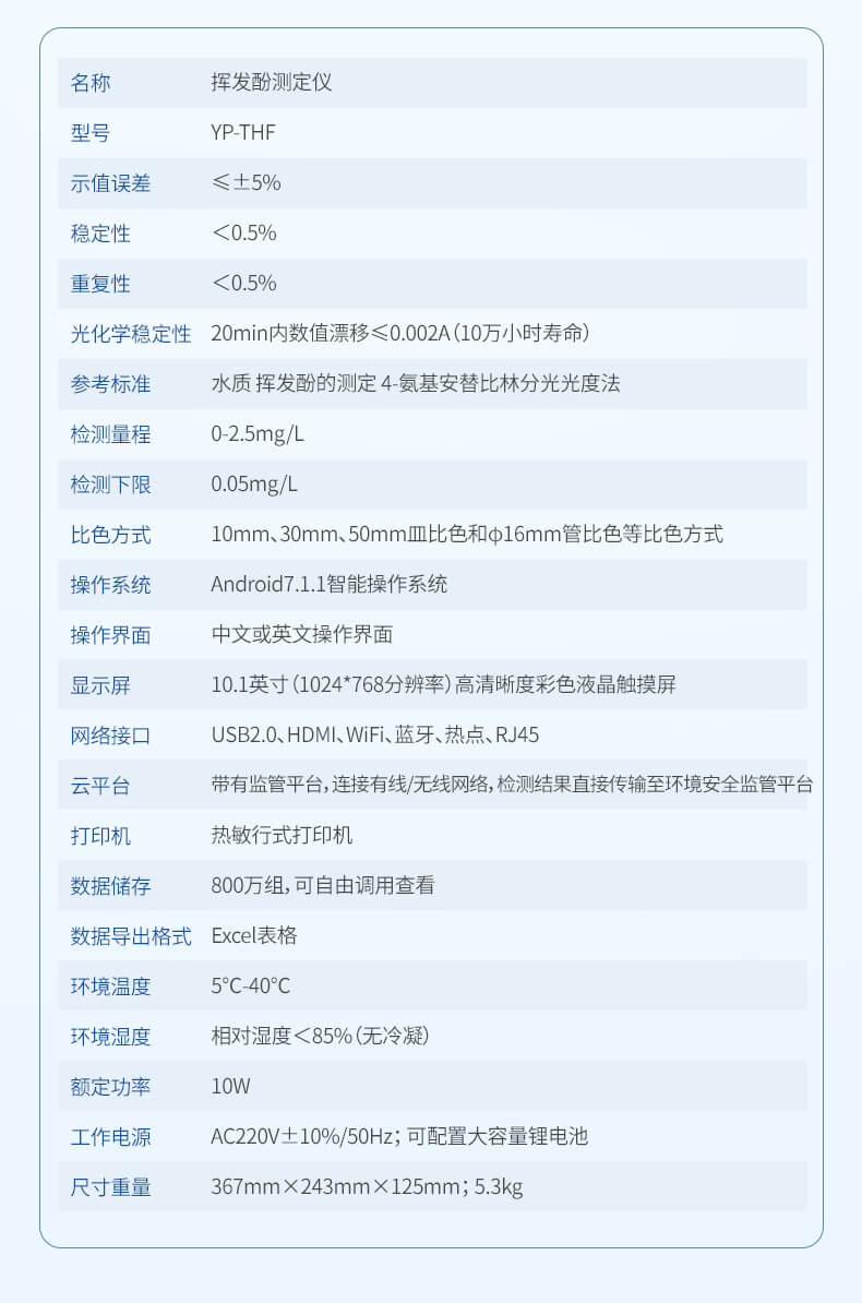 本儀器主要檢測水質揮發性酚含量指標,兼具智能數據分析功能,圖表、列表顯示數據,分析一目了然;高清晰度彩色液晶觸摸顯示屏,Android智能操作系統,中文顯示界面,中英文鍵盤,人性化操作,使用更簡單。