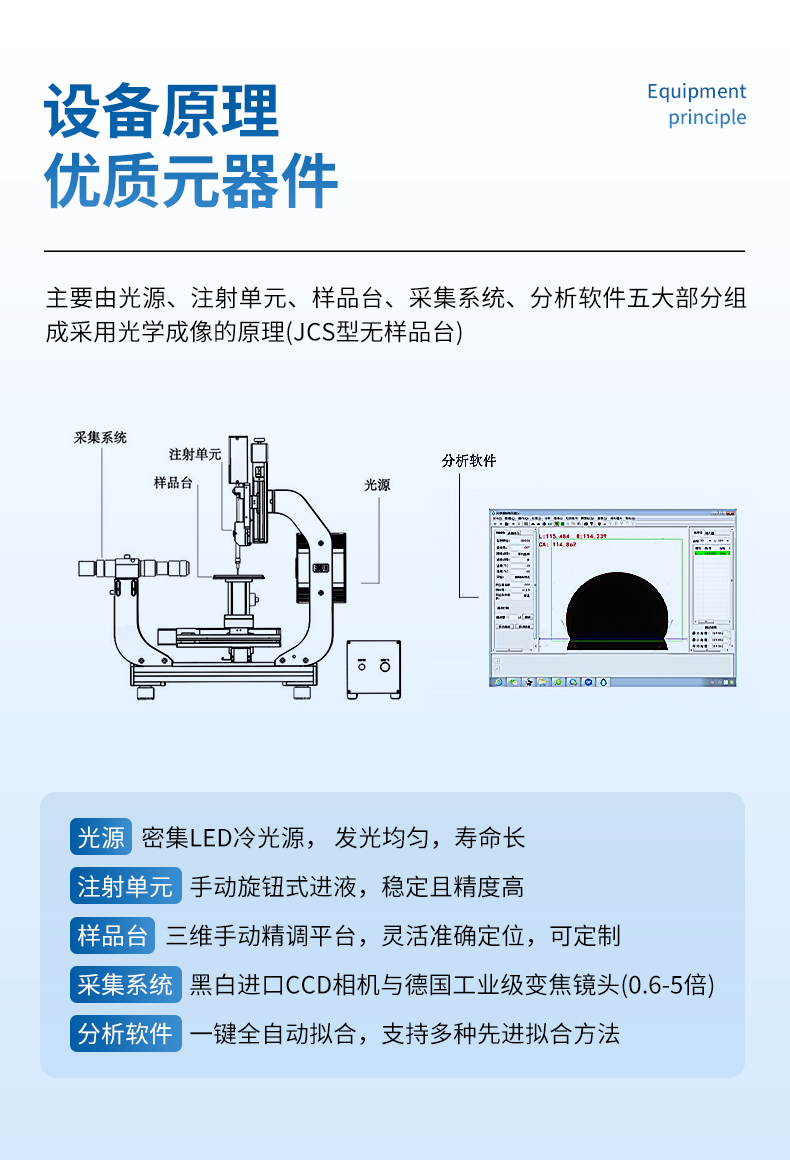 接觸角測量儀主要由光源、注射單元、采集系統、分析軟件四大部分組成,設備采用光學成像的原理。