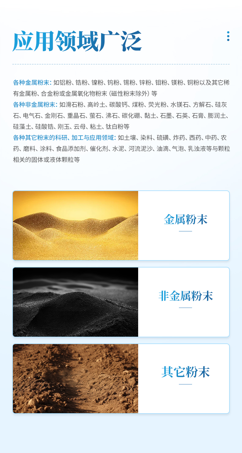 3.各種其它粉末的科研、加工與應(yīng)用領(lǐng)域:如土壤、染料、乳液、硫磺、炸藥、西藥、中藥、農(nóng)藥、磨料、涂料、食品添加劑、催化劑、水泥、河流泥沙、油滴、氣泡、乳濁液等與顆粒相關(guān)的固體或液體顆粒等。