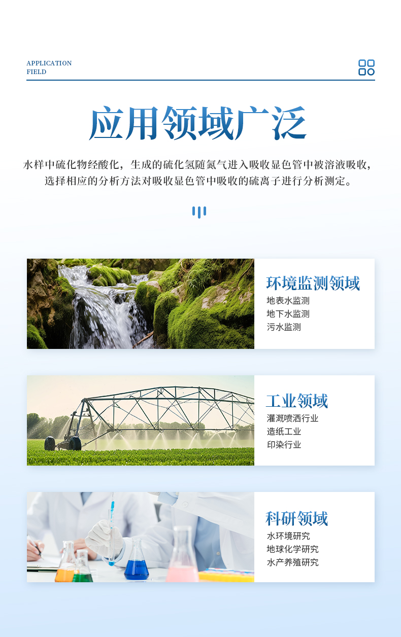水樣中的硫化物經(jīng)酸化,生成的硫化氫隨載氣(氮氣)進(jìn)入吸收瓶/吸收顯色管中被吸收溶液(乙酸鋅-乙酸鈉溶液或2%氫氧化鈉溶液)吸收,選擇相應(yīng)的分析方法對吸收瓶/吸收顯色管中吸收的硫離子進(jìn)行分析測定。