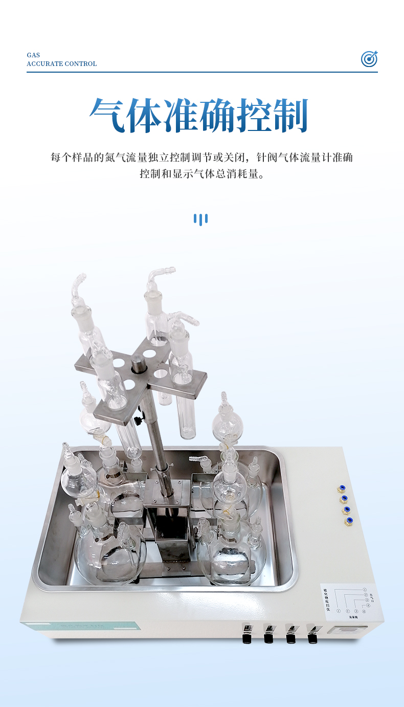 5、每個樣品的氮氣流量獨立控制調(diào)節(jié)或關(guān)閉,針閥氣體流量計準(zhǔn)確控制和顯示氣體總消耗量。