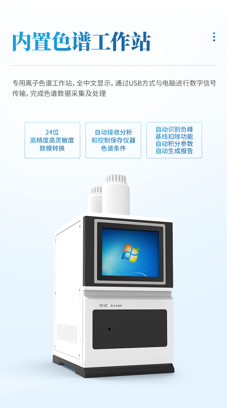 5.2專用離子色譜工作站,全中文顯示,通過USB方式與電腦進行數字信號傳輸,完成色譜數據采集及處理。