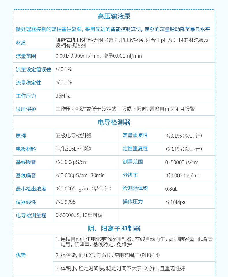 3.1連續自動再生電化學微膜抑制器,在線自動再生,高抑制容量,低背景電導,低噪聲,基線穩定,免維護。