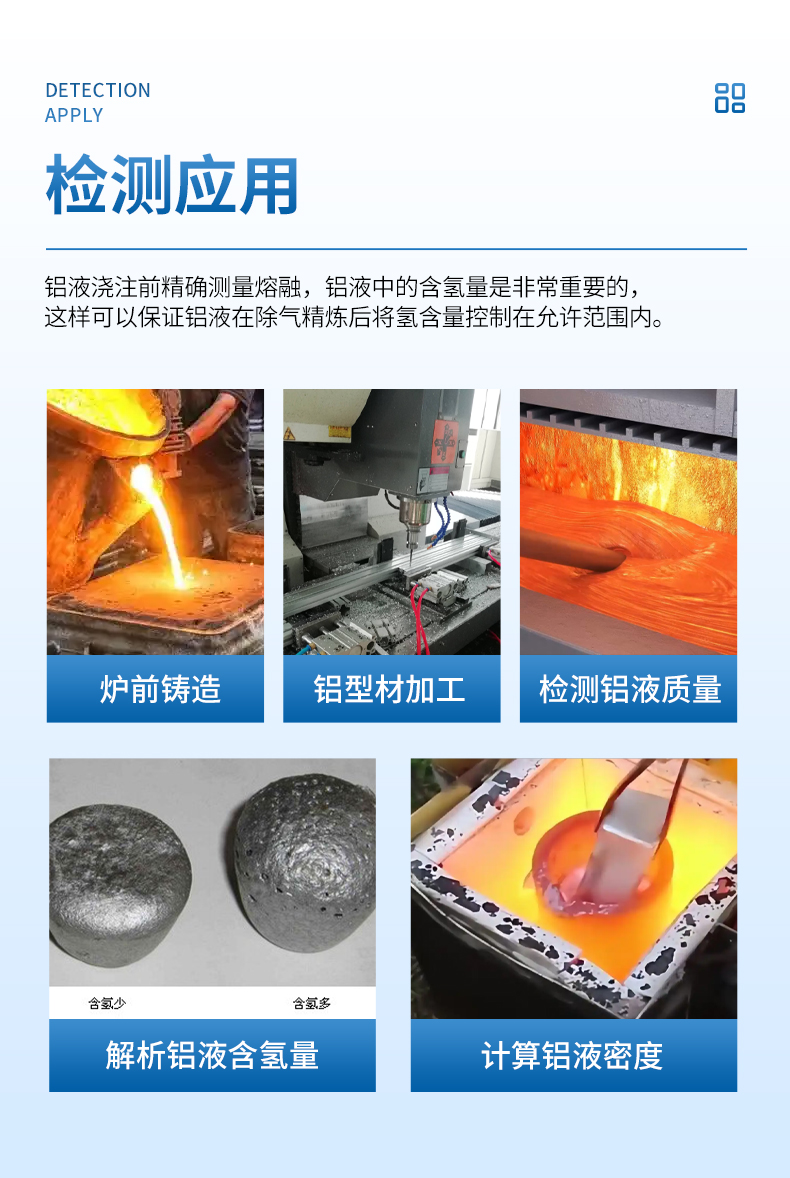 鋁液中唯一大量存在的氣體氫和各種夾渣的存在,使得鋁鑄件極易產生針孔、 顯微疏松等缺陷,導致力學性能、內部質量大為降低。因此在澆注前精確測量熔融鋁液中的含氫量是非常重要的,這樣可以保證鋁液在除氣精煉后將氫含量控制在允許范圍內。