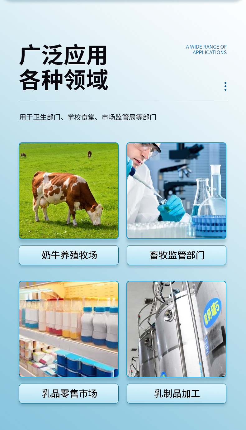 該儀器主要用于乳制品中脂肪,蛋白質、乳糖、非脂固形物、密度、摻水率、冰點、灰份、溫度的測定,適用于牛奶、羊奶、UHT奶、駝奶等分析,是現代牧場、鮮奶收購站和中小型乳品企業監控乳品質量極為理想的儀器。