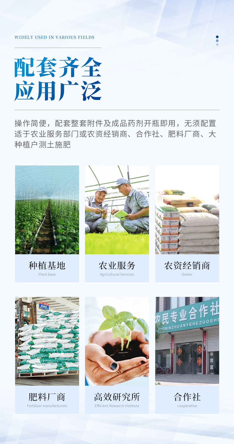 配套齊全:該儀器相當于一個小型實驗室,無需用戶自配附件。適于農業服務部門或農資經銷商、高教院校、科研院所、合作社、肥料廠商、大種植戶測土施肥和鑒別肥料真假及環保檢測應用。