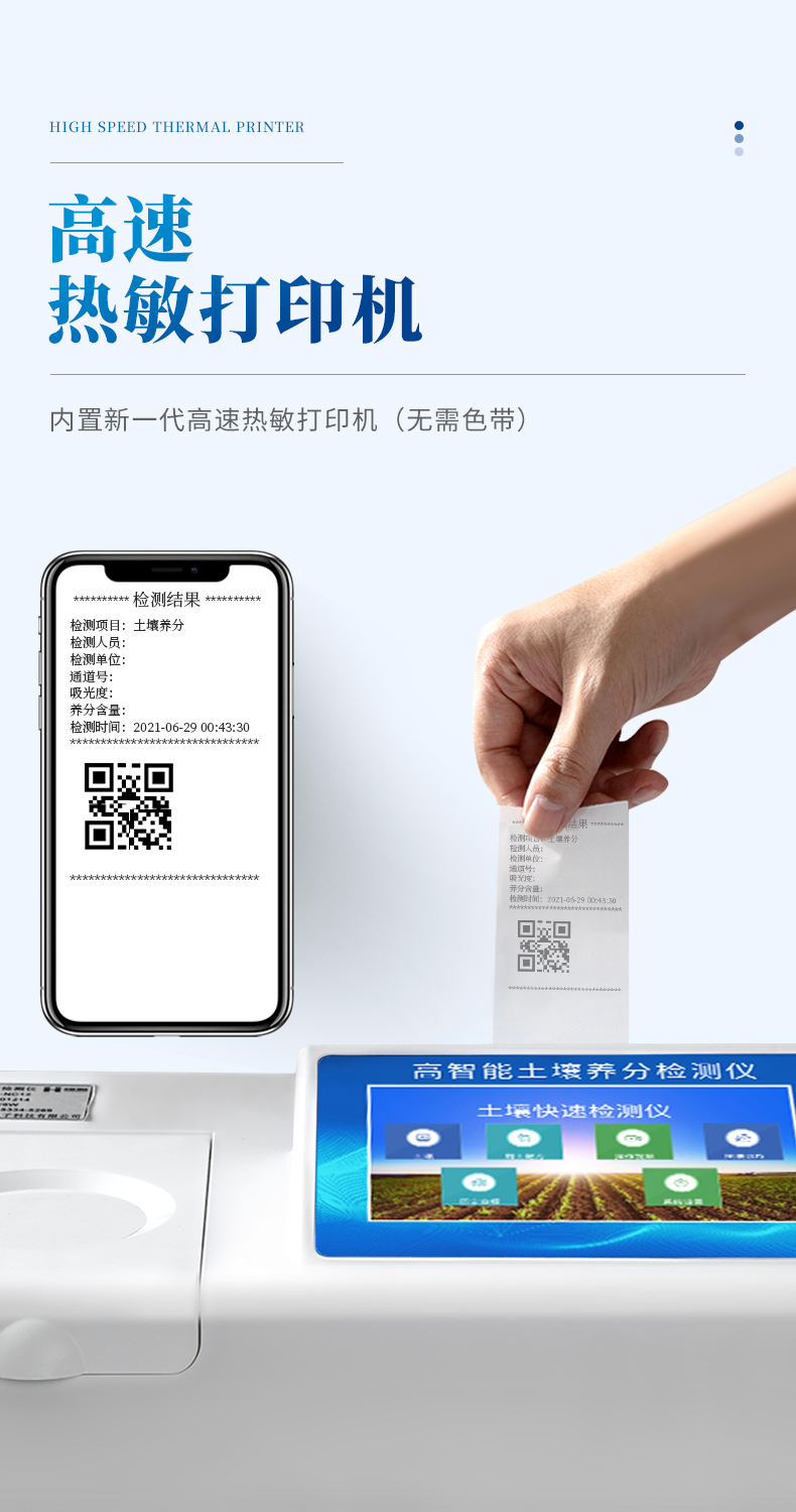 14、內置新一代高速熱敏打印機(無需色帶),打印內容包含:檢測單位、檢測人員、檢測項目、通道號、吸光度、養分含量(mg/kg)、檢測時間、以及二維碼等信息