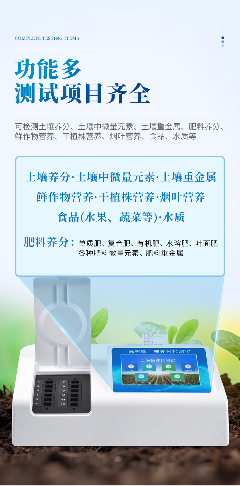 1、土壤養分:●土壤銨態氮、土壤有效磷、土壤速效鉀、土壤硝態氮、土壤水解氮、土壤全氮、土壤全磷、土壤全鉀、土壤有機質(丘林法)、土壤有機質(浸提法)、土壤總有機碳、土壤碳氮比、PH值、含鹽量、水分。●土壤中微量元素:土壤鈣、土壤鎂、土壤硫、土壤硅、土壤硼、土壤鐵、土壤銅、土壤錳、土壤鋅、土壤氯、土壤鉬;●土壤重金屬:土壤鉛、土壤砷、土壤鎘、土壤鉻、土壤汞、土壤鎳、土壤鋁、土壤氟、土壤鈦、土壤硒。