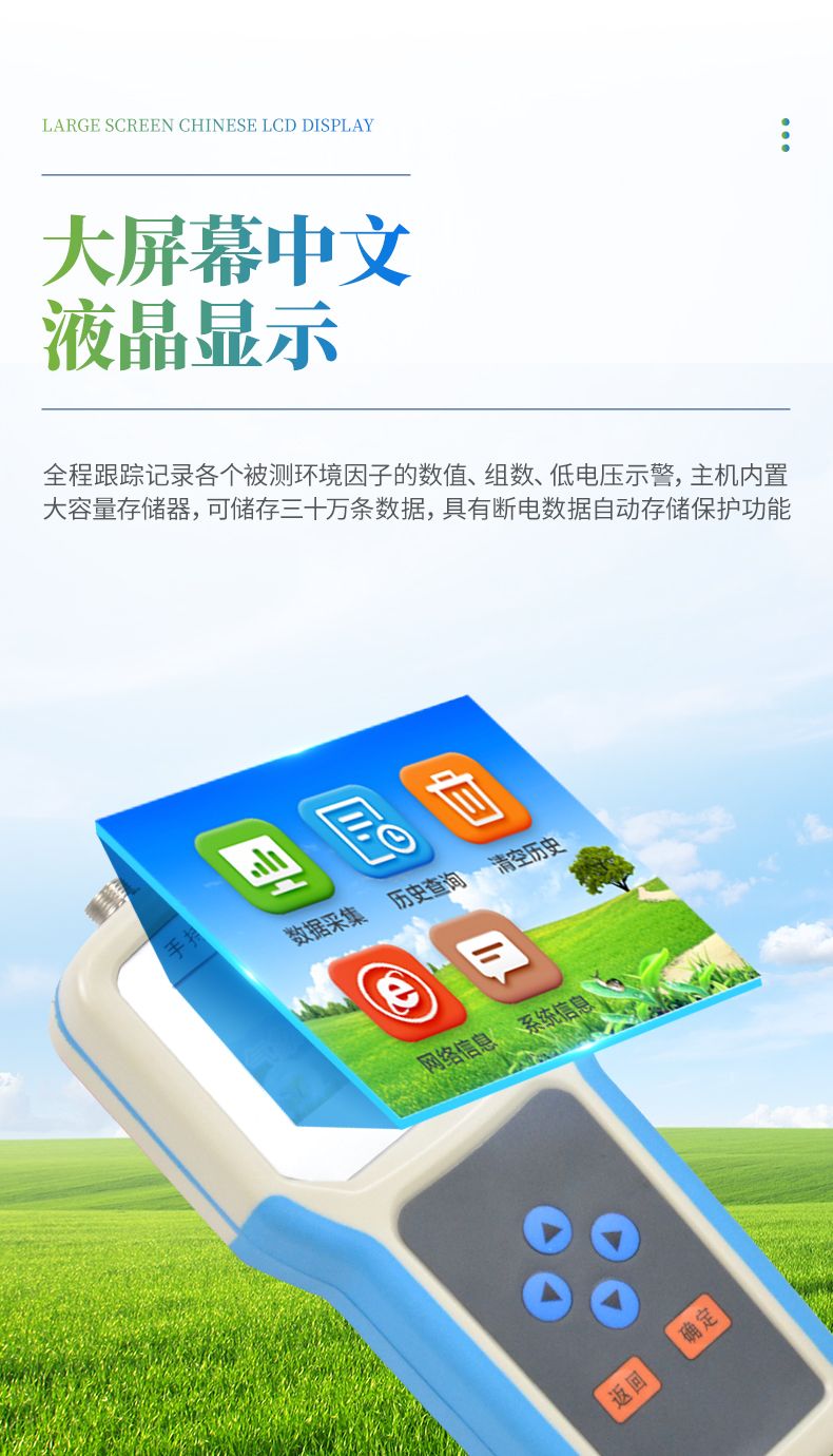 大屏幕中文液晶顯示,全程跟蹤記錄各個被測環(huán)境因子的數(shù)值、組數(shù)、低電壓示警,主機內(nèi)置大容量存儲器,可儲存三十萬條數(shù)據(jù),具有斷電數(shù)據(jù)自動存儲保護功能。