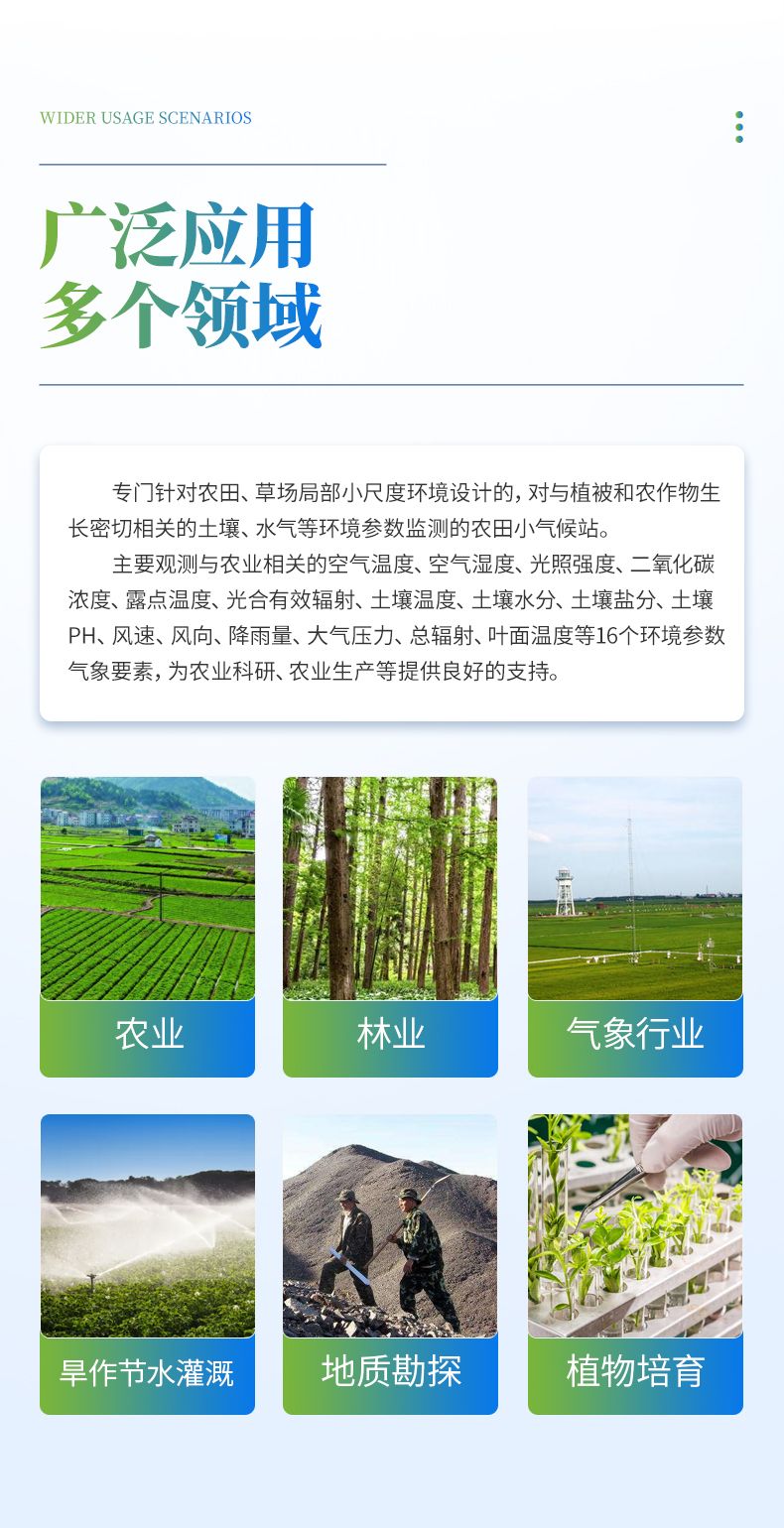 廣泛應用于農(nóng)業(yè)、林業(yè)、環(huán)保、水利、氣象行業(yè)、旱作節(jié)水灌溉、地質(zhì)勘探、植物培育等領(lǐng)域。