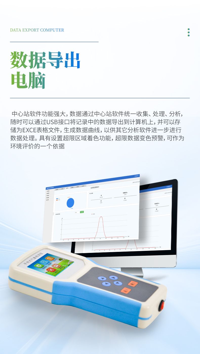 中心站軟件功能強大,數(shù)據(jù)通過中心站軟件統(tǒng)一收集、處理、分析,隨時可以通過USB接口將記錄中的數(shù)據(jù)導出到計算機上,并可以存儲為EXCE表格文件,生成數(shù)據(jù)曲線,以供其它分析軟件進一步進行數(shù)據(jù)處理。具有設(shè)置超限區(qū)域著色功能,超限數(shù)據(jù)變色預警,可作為環(huán)境評價的一個依據(jù)。