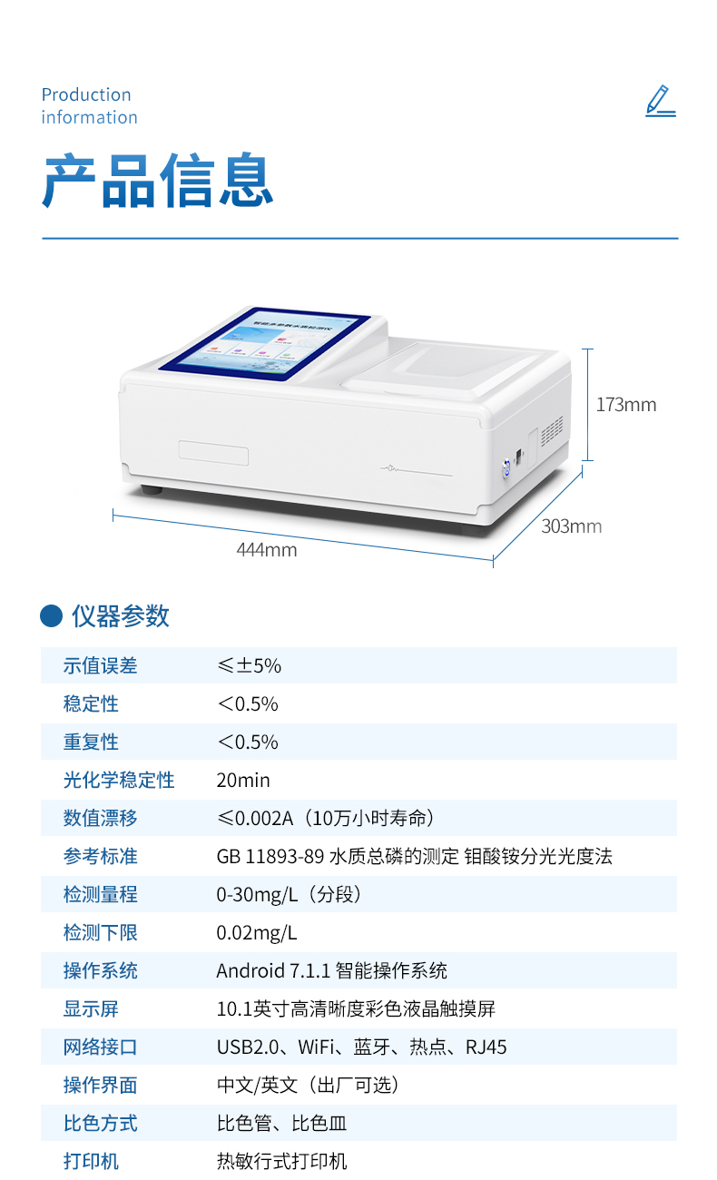智能總磷測定儀是參考《GB 11893-89 水質(zhì)總磷的測定 鉬酸銨分光光度法》標(biāo)準(zhǔn)設(shè)計(jì)制造,主要檢測水質(zhì)總磷濃度指標(biāo);本儀器兼具智能數(shù)據(jù)分析功能,圖表、列表顯示數(shù)據(jù),分析一目了然;高清晰度彩色液晶觸摸顯示屏,Android智能操作系統(tǒng),中文顯示界面,中英文鍵盤,人性化操作,使用更簡單。
