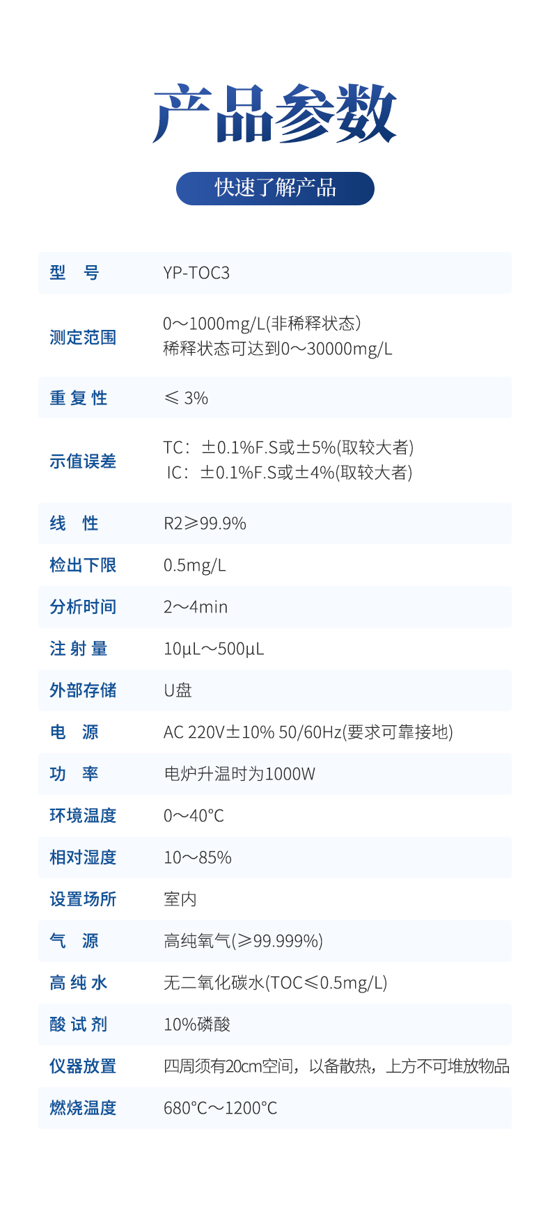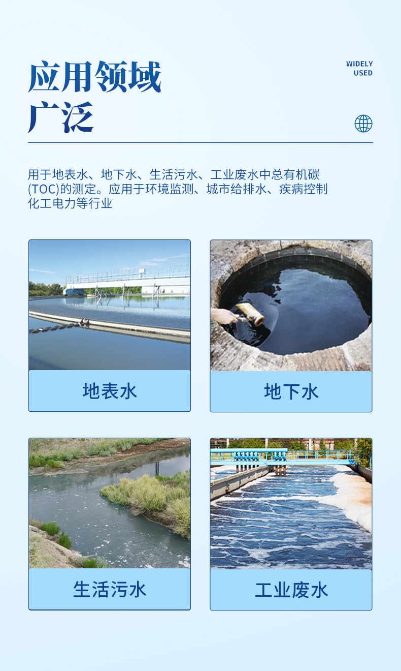 地表水、地下水、生活污水、工業廢水中總有機碳(TOC)的測定,應用于環境監測、城市給排水、疾病控制、化工電力等行業。