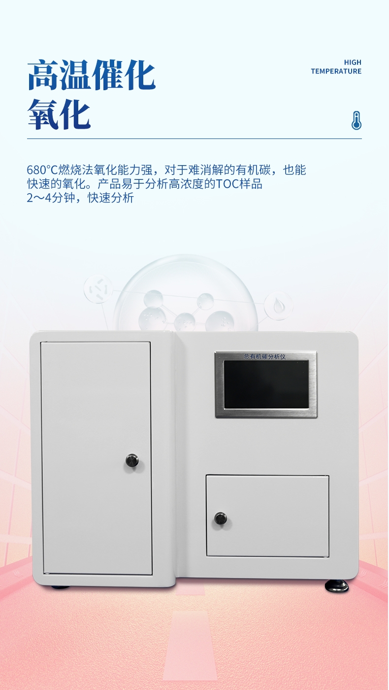 1.高溫催化氧化,對于難消解的有機碳,也能高效率的氧化,使得產品易于分析高濃度的TOC樣品;
