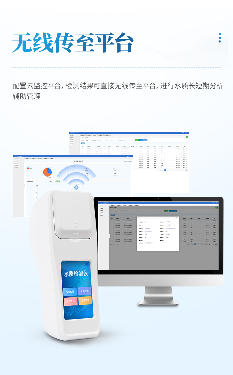 ②配置云監控平臺,檢測結果可直接無線傳至平臺,進行水質長短期分析,輔助管理。