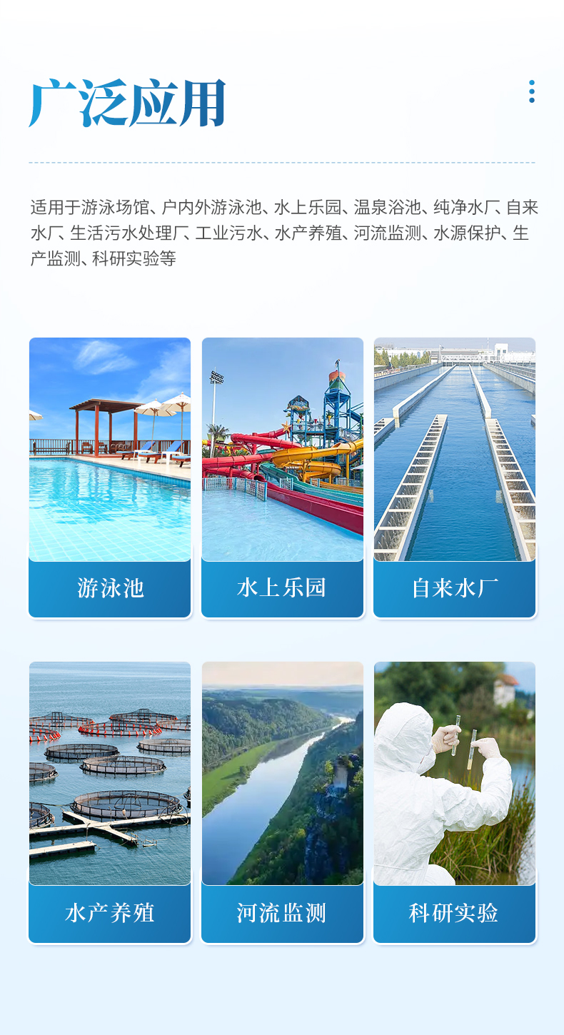 適用于游泳場館、戶內外游泳池、水上樂園、溫泉浴池、純凈水廠、自來水廠、生活污水處理廠、工業污水、水產養殖、河流監測、水源保護、生產監測、科研實驗等。