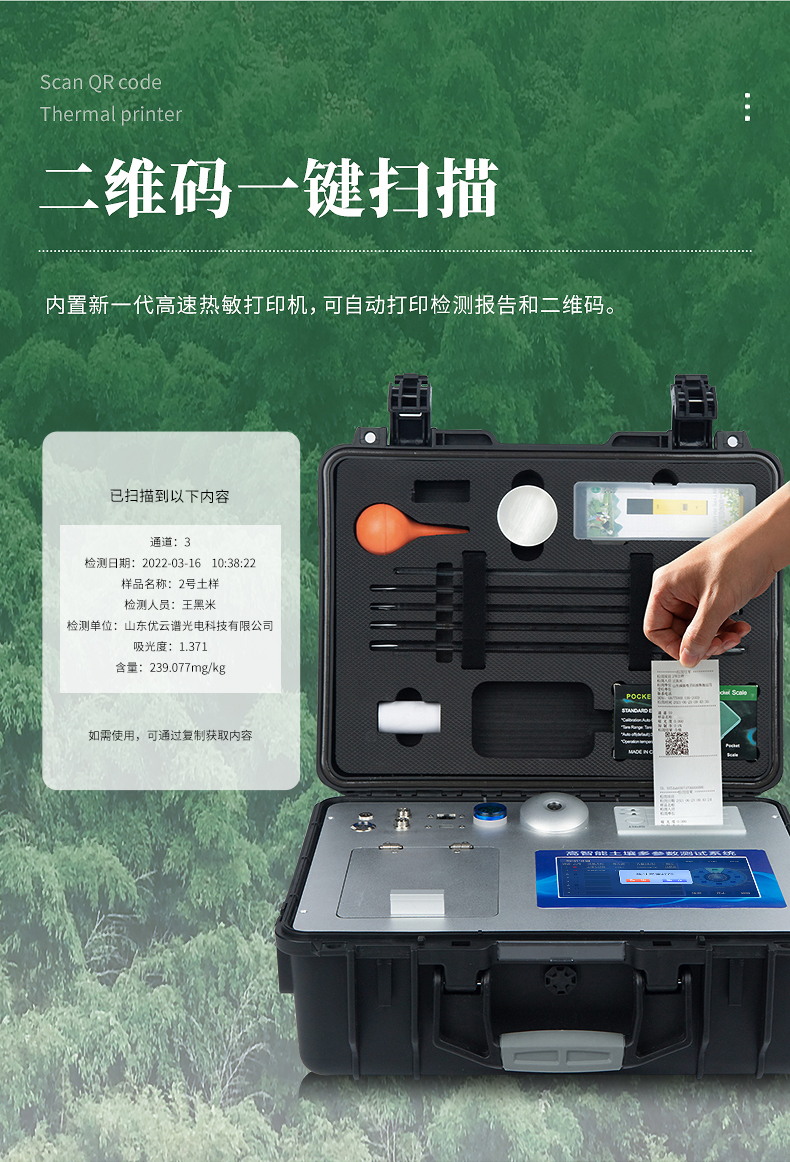 21、內(nèi)置新一代高速熱敏打印機(jī)(無需色帶),打印內(nèi)容包含:檢測(cè)單位、檢測(cè)人員、檢測(cè)項(xiàng)目、通道號(hào)、吸光度、養(yǎng)分含量(mg/kg)、檢測(cè)時(shí)間、以及二維碼等信息
