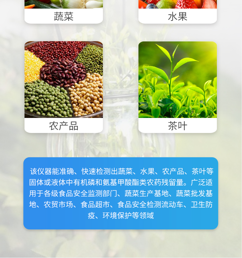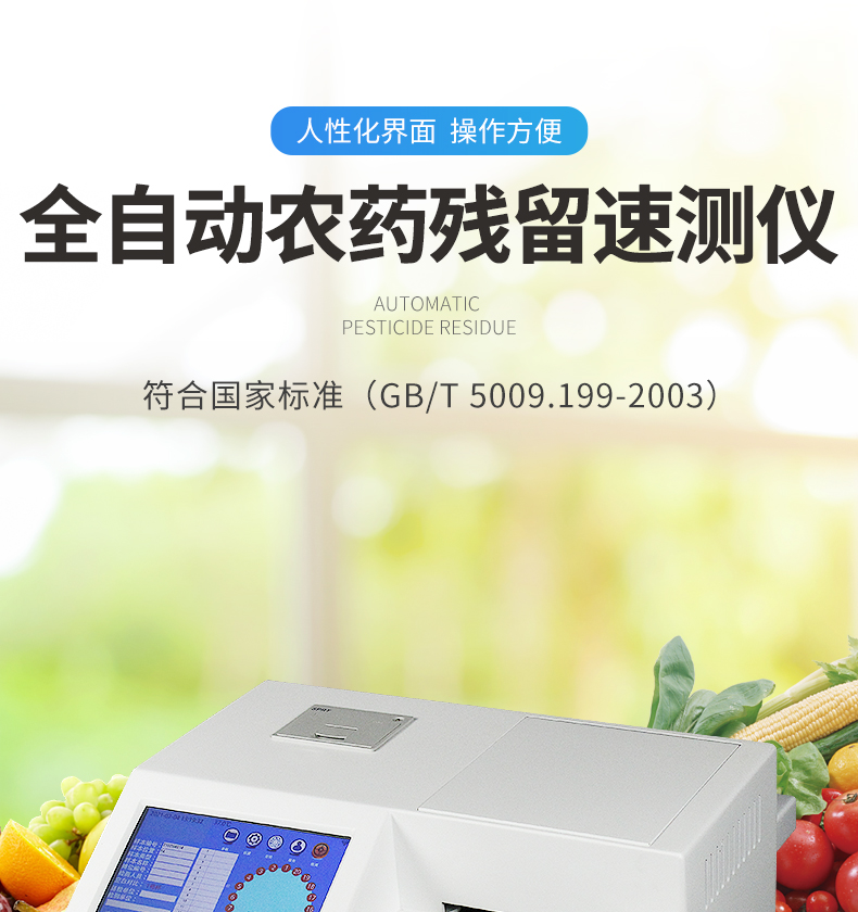 該儀器依據(jù)國家標準(GB/T 5009.199-2003)和農(nóng)業(yè)標準方法(NY/T 448-2001)中的酶抑制率法設(shè)計制造,能準確、快速檢測出蔬菜、水果、農(nóng)產(chǎn)品、茶葉等固體或液體中有機磷和氨基甲酸酯類農(nóng)藥殘留量。廣泛適用于各級食品安全監(jiān)測部門、蔬菜生產(chǎn)基地、蔬菜批發(fā)基地、農(nóng)貿(mào)市場、食品超市、食品安全檢測流動車、衛(wèi)生防疫、環(huán)境保護等領(lǐng)域。