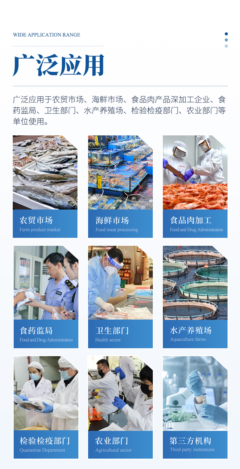 該設(shè)備可快速檢測(cè)魚(yú)、蝦等水產(chǎn)類(lèi)中的氯霉素、孔雀石綠、四環(huán)素類(lèi)、硝基呋喃類(lèi)、磺胺類(lèi)、喹諾酮沙星類(lèi);添加劑類(lèi)甲醛、雙氧水、工業(yè)堿、過(guò)氧化苯甲酰、草酸等;重金屬鉛、鉻、鎘、汞、砷等快速檢測(cè),該快速檢測(cè)系統(tǒng)設(shè)備利用抑制免疫層析的原理和光電比色法,為集成化食品安全快速檢測(cè)分析設(shè)備,廣泛應(yīng)用于養(yǎng)殖場(chǎng)、屠宰場(chǎng)、食品肉產(chǎn)品深加工企業(yè)、檢驗(yàn)檢疫部門(mén)、食藥監(jiān)局、衛(wèi)生部門(mén)、高教院校、科研院所、農(nóng)業(yè)部門(mén)等單位使用。