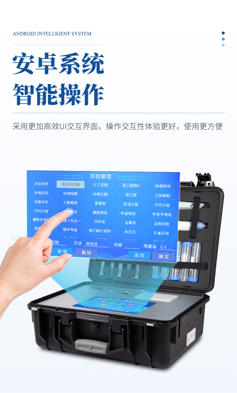 6、一體化便攜式快檢設(shè)備,滿(mǎn)足現(xiàn)場(chǎng)及流動(dòng)檢測(cè)使用需求,能夠在同一軟件下實(shí)現(xiàn)所有檢測(cè)項(xiàng)目的檢測(cè),并可通過(guò)同一窗口直觀(guān)顯示檢測(cè)結(jié)果。