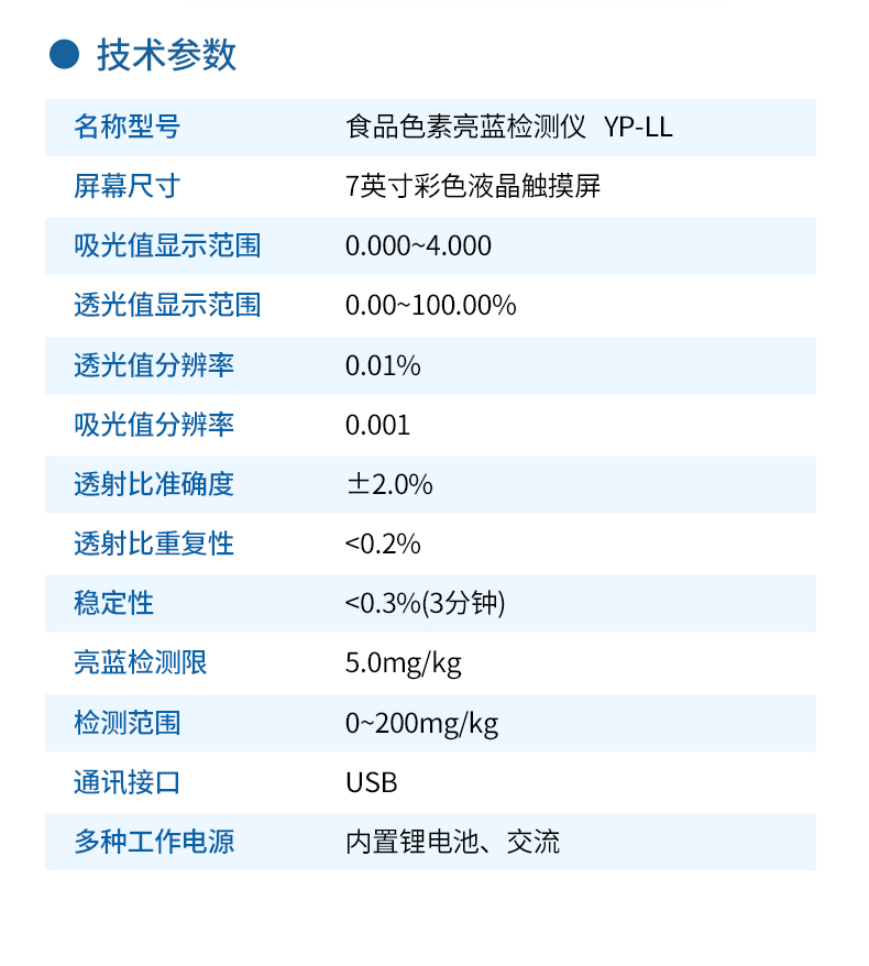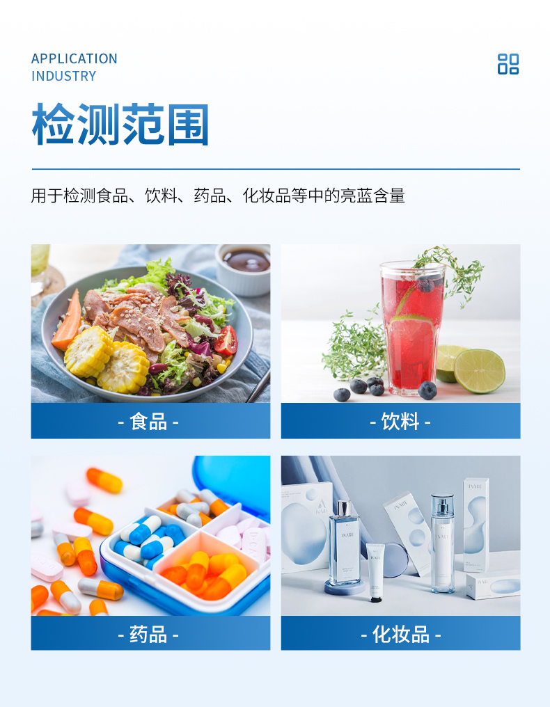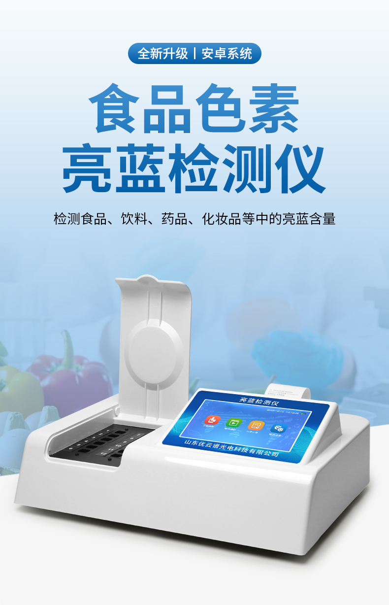 亮藍檢測儀,主要用于檢測食品、飲料、藥品、化妝品等中的亮藍含量,?具有操作簡單的特點。亮藍,又稱為誘惑藍,是一種常用的合成食品著色劑,廣泛應用于食品、飲料和藥品中。通過亮藍檢測儀的檢測結果,可以看出這些產品中的亮藍含量是否符合國家和國際標準,從而保障其安全性和合規性? 。