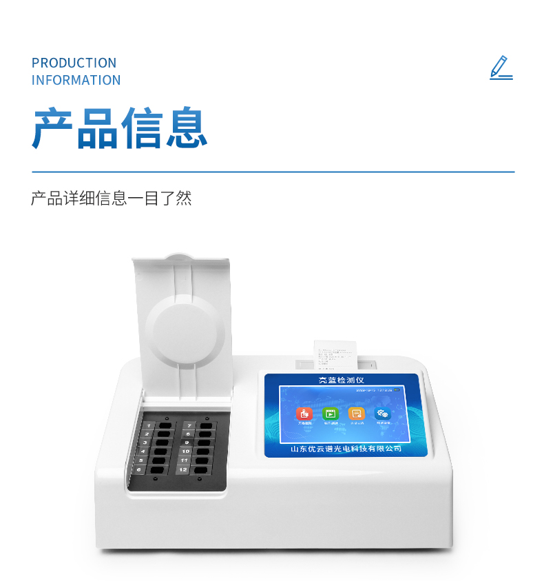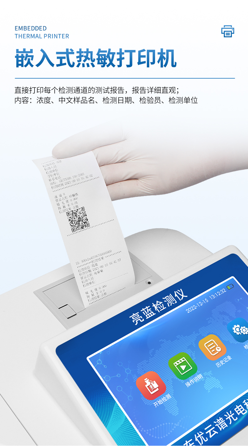 ●帶有嵌入式微型熱敏打印機,直接打印每個檢測通道的測試報告,報告詳細直觀,內容:濃度、中文樣品名、檢測日期、檢驗員、檢測單位