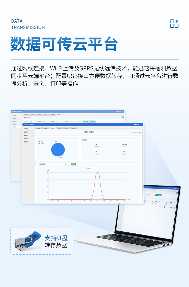 ●配置USB接口,支持U盤轉存,方便數據轉存至云平臺,通過平臺實現數據查詢、瀏覽、分析、統計、打印等。