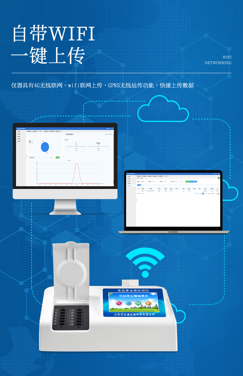 10、支持Wifi網絡,數據可局域網和互聯網數據上傳,檢測結果直接傳至食品安全監管平臺。進行區域食品安全監管及大數據分析處理,檢測區域食品安全長短期動態,達到食品安全問題預估、預警