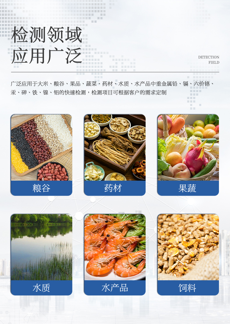 YP-BZ08重金屬檢測儀可廣泛應用于大米、糧谷、果品、蔬菜、藥材、水質、水產品中重金屬鉛、鎘、六價鉻、汞、砷、鐵、鎳、鋁的快速檢測,檢測項目可根據客戶的需求定制。