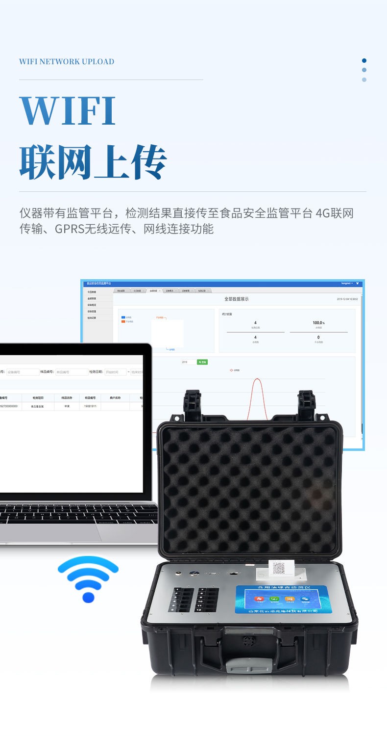 ★4、儀器帶有監(jiān)管平臺,數(shù)據(jù)可局域網(wǎng)和互聯(lián)網(wǎng)數(shù)據(jù)上傳,檢測結(jié)果直接傳至食品安全監(jiān)管平臺。進行區(qū)域食品安全監(jiān)管及大數(shù)據(jù)分析處理與數(shù)據(jù)統(tǒng)計,檢測區(qū)域食品安全長短期動態(tài),達到食品安全問題預估、預警