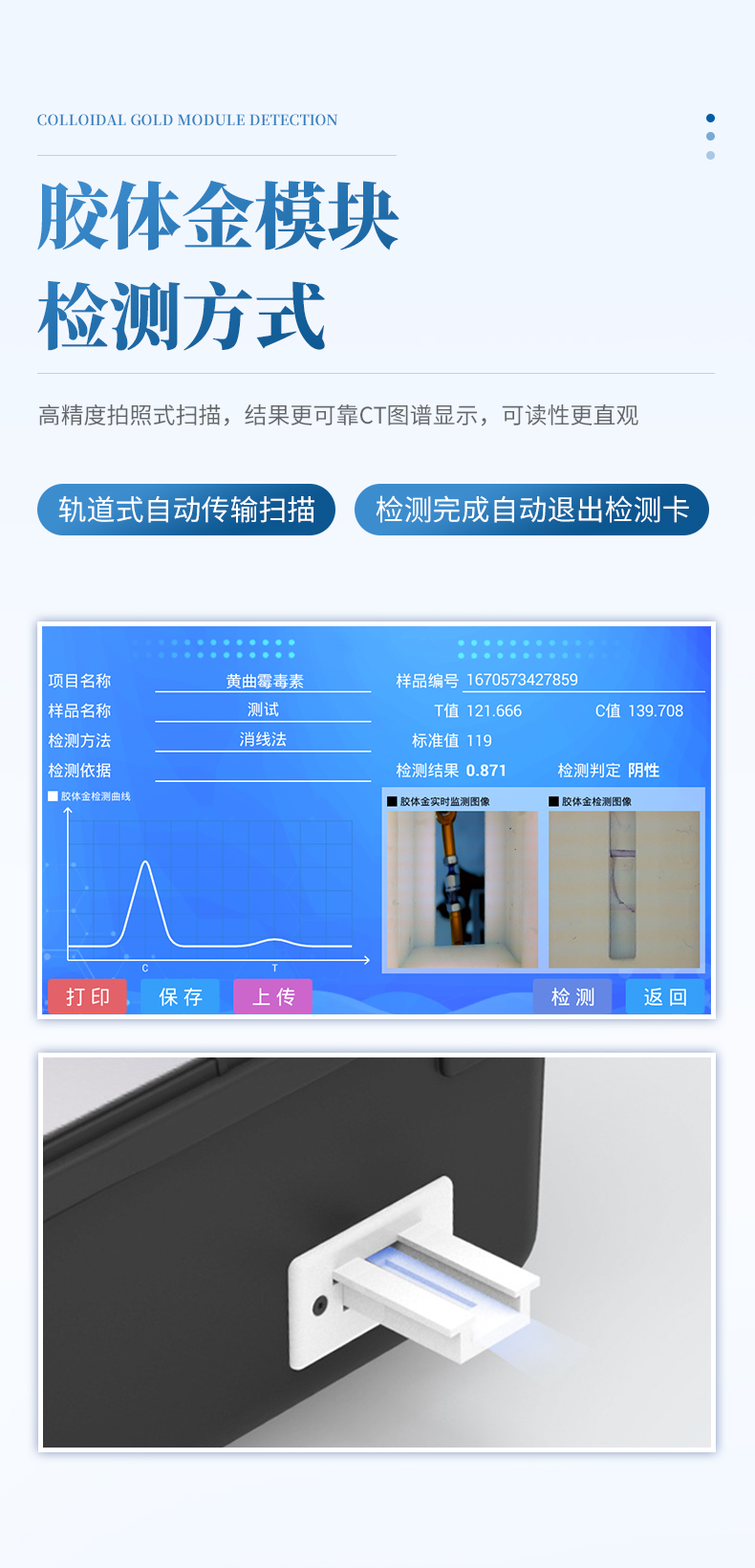 6、膠體金模塊檢測方式:軌道式自動傳輸掃描,檢測完成后自動退出檢測卡。