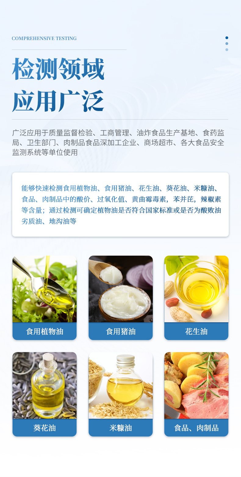 廣泛應(yīng)用于質(zhì)量監(jiān)督檢驗(yàn)、工商管理、油炸食品生產(chǎn)基地、食藥監(jiān)局、衛(wèi)生部門、肉制品食品深加工企業(yè)、農(nóng)業(yè)部門、檢驗(yàn)檢疫部門、商場(chǎng)超市、各大食品安全監(jiān)測(cè)系統(tǒng)等單位使用。