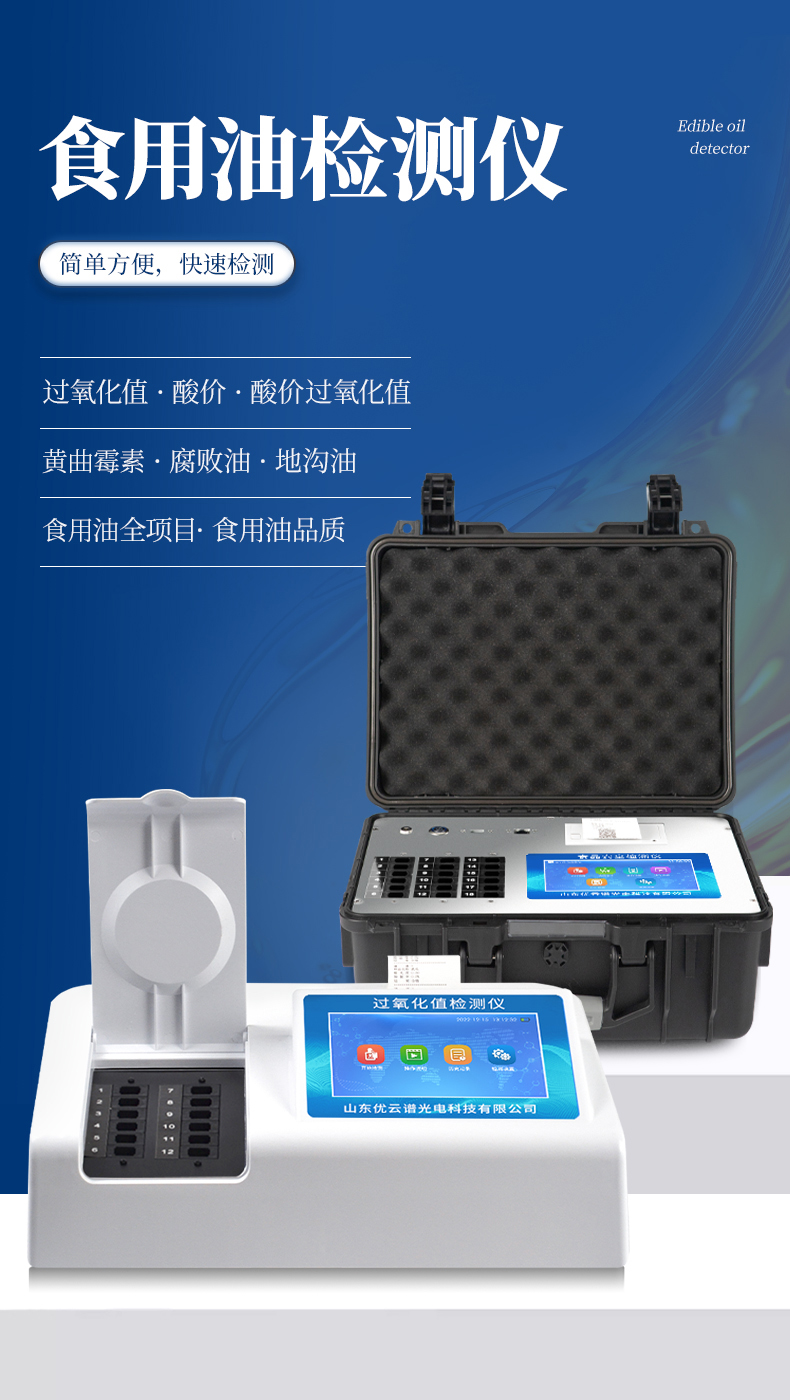 食用油安全檢測(cè)檢測(cè)儀為集成化油品快速檢測(cè)分析設(shè)備,能夠快速檢測(cè)食用植物油、食用豬油、花生油、葵花油、米糠油、食品、肉制品中的酸價(jià)、過氧化值、黃曲霉毒素,苯并芘,辣椒素等含量;通過檢測(cè)可確定植物油是否符合國(guó)家標(biāo)準(zhǔn)或是否為酸敗油、劣質(zhì)油、地溝油等。儀器預(yù)留其他項(xiàng)目檢測(cè)程序和端口,根據(jù)日后需求可方便的自主增加檢測(cè)項(xiàng)目。日后可升級(jí)為檢測(cè)水產(chǎn)品、面制品的綜合類型儀器。