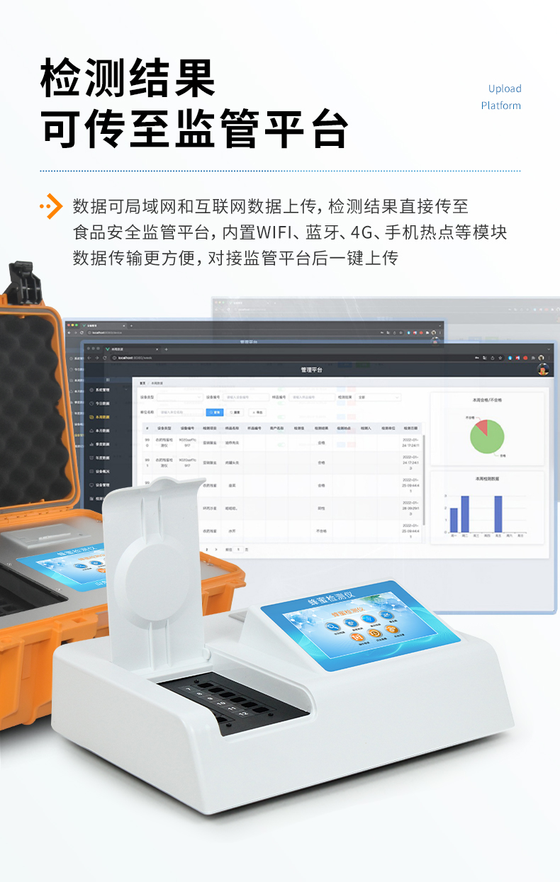 8、儀器帶有監(jiān)管平臺。數(shù)據(jù)可局域網和互聯(lián)網數(shù)據(jù)上傳,檢測結果直接傳至食品安全監(jiān)管平臺。進行區(qū)域食品安全監(jiān)管及大數(shù)據(jù)分析處理,檢測區(qū)域食品安全長短期動態(tài),達到食品安全問題預估、預警。