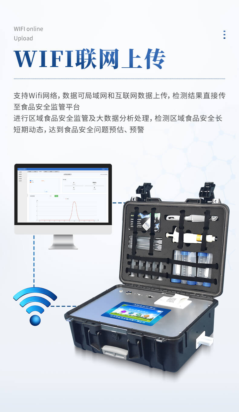13、支持Wifi網(wǎng)絡(luò),數(shù)據(jù)可局域網(wǎng)和互聯(lián)網(wǎng)數(shù)據(jù)上傳,檢測(cè)結(jié)果直接傳至食品安全監(jiān)管平臺(tái)。進(jìn)行區(qū)域食品安全監(jiān)管及大數(shù)據(jù)分析處理,檢測(cè)區(qū)域食品安全長(zhǎng)短期動(dòng)態(tài),達(dá)到食品安全問題預(yù)估、預(yù)警