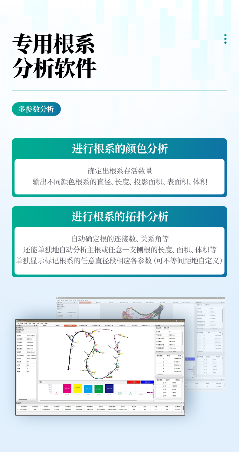 (15)能進行根系的拓撲分析,自動確定根的連接數、關系角等,還能單獨地自動分析主根或任意一支側根的長度、面積、體積等,可單獨顯示標記根系的任意直徑段相應各參數(可不等間距地自定義)。