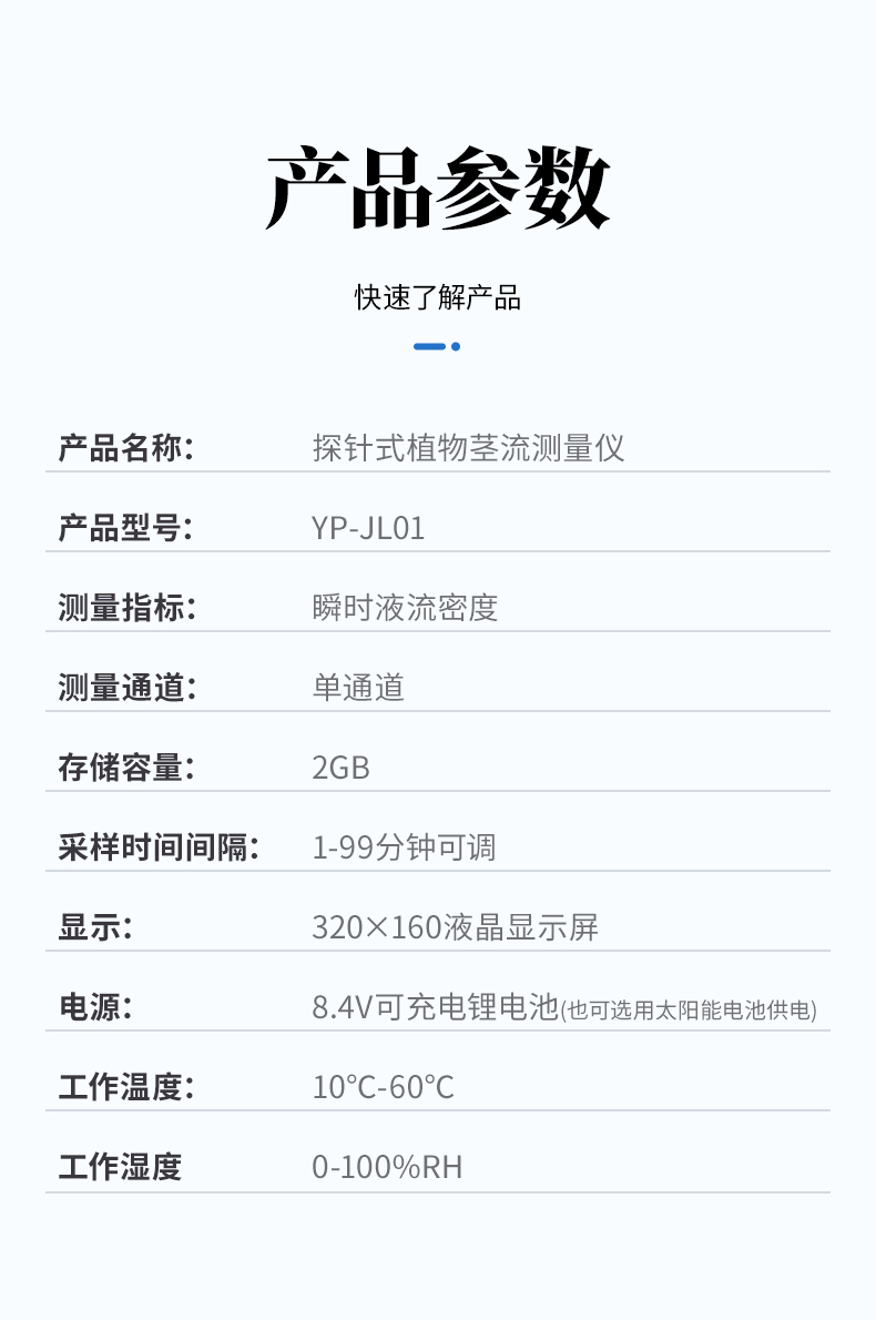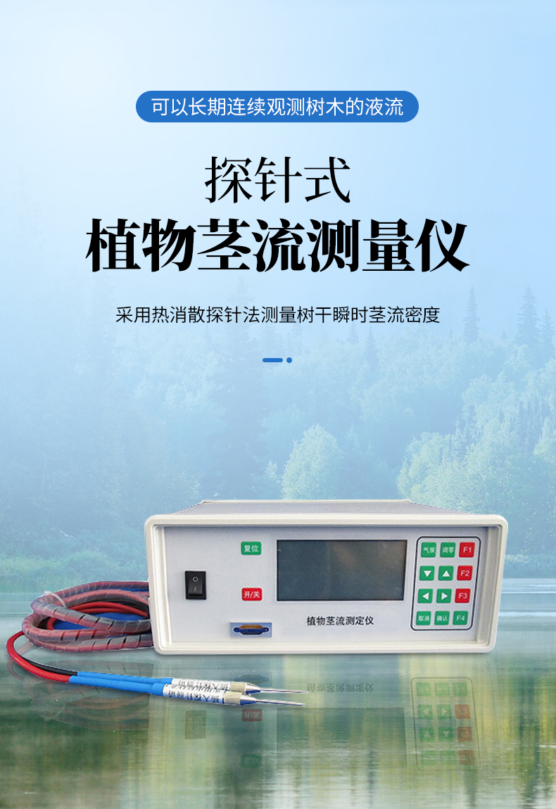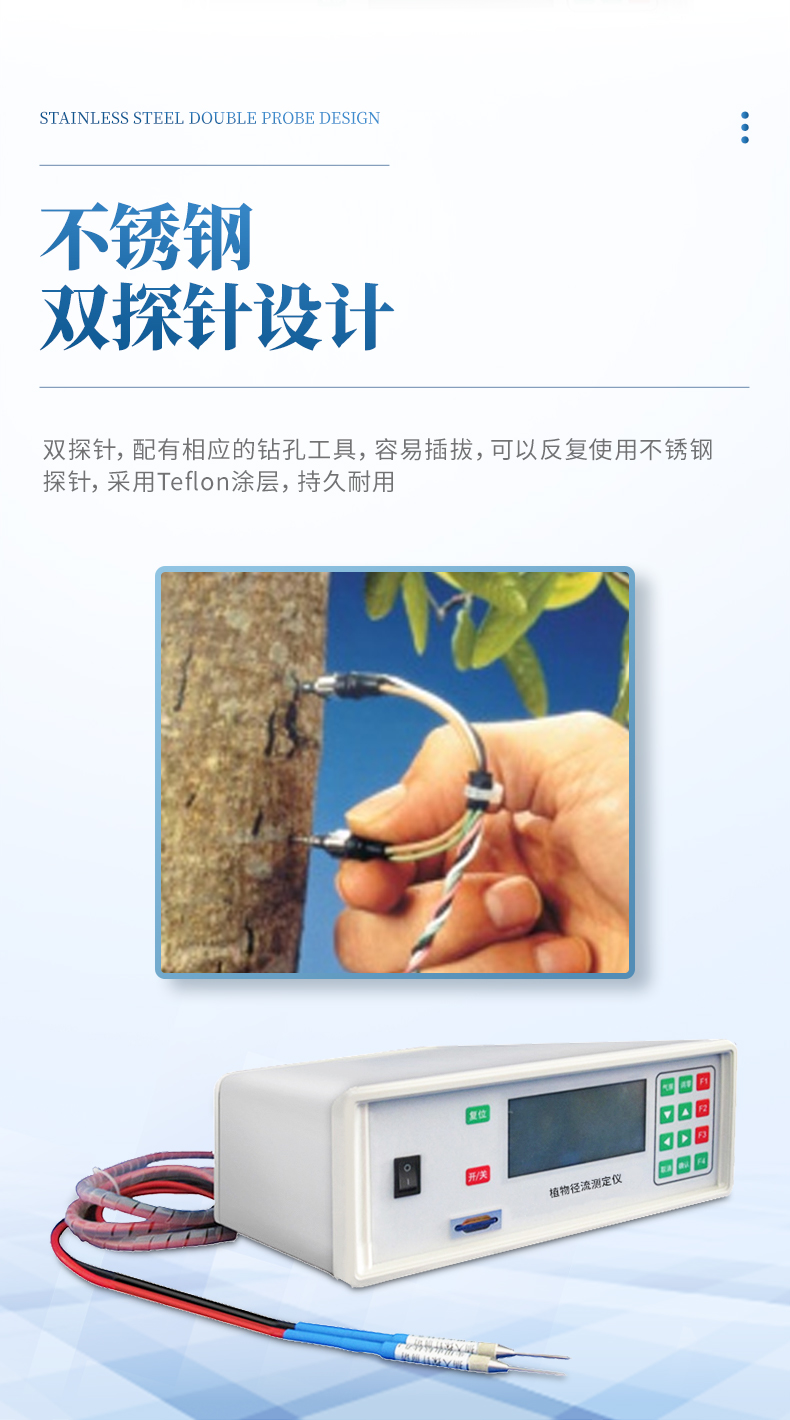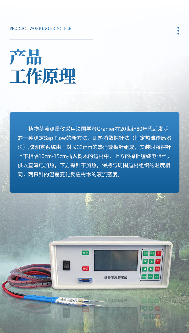 植物莖流測量儀采用法國學者Granier在20世紀80年代后發明的一種測定Sap Flow的新方法,即熱消散探針法(恒定熱流傳感器法)。該方法的數據采集具有準確穩定的特點,而且可以連續不間斷的讀取數據,因而數據具有系統性。該測 定系統由一對長33mm的熱消散探針組成,安裝時將探針上下相隔10cm-15cm插入樹木的邊材中,上方的探針纏繞電阻絲,供以直流電加熱,下方探針不 加熱,保持與周圍邊材組織的溫度相同,兩探針的溫差變化反應樹木的液流密度。
