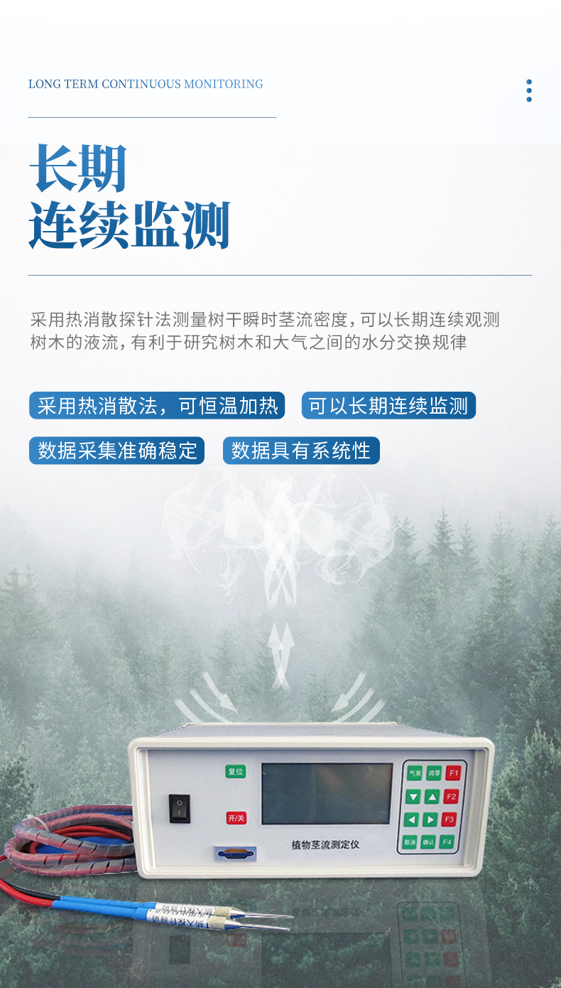 植物莖流測量儀采用熱消散探針法測量樹干瞬時莖流密度,可以長期連續觀測樹木的液流,有利于研究樹木和大氣之間的水分交換規律,并以此為觀測手段,長期監測森林生態系統對環境變化的影響。對于造林綠化、森林管理和林業管理等具有重要的理論指導意義和應用價值。