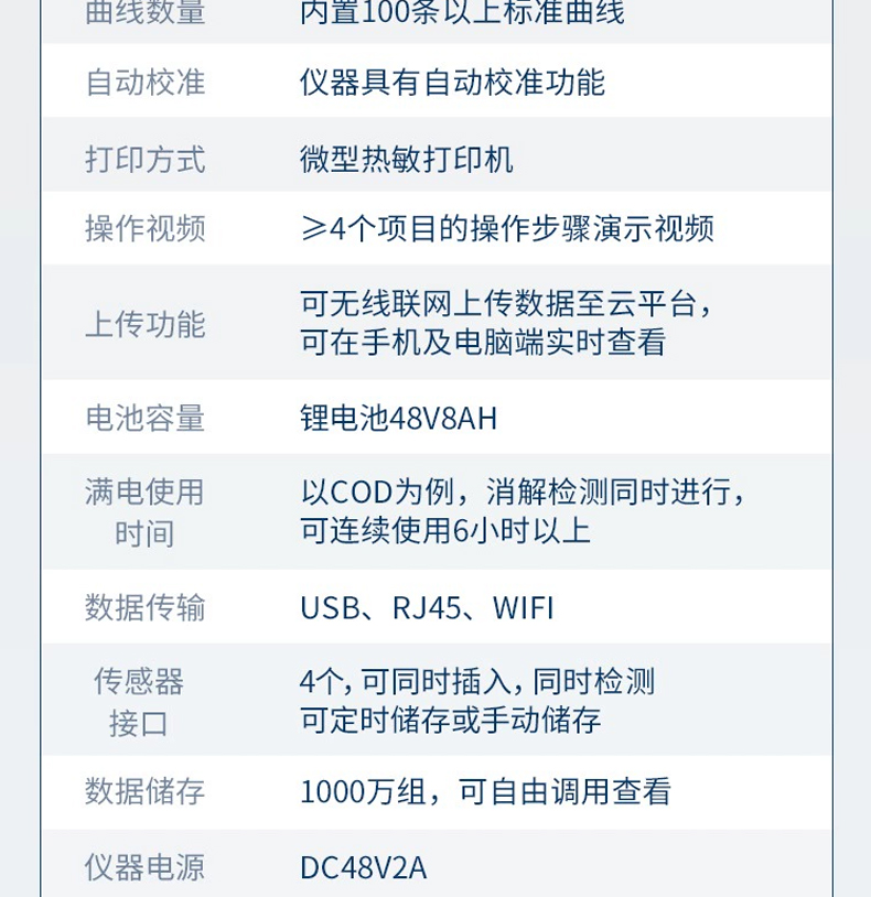 滿電使用時間:以COD為例,消解檢測同時進(jìn)行,可連續(xù)使用6小時以上;