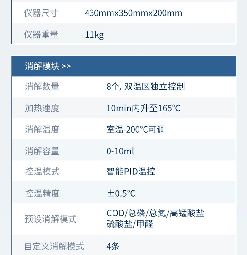 4、內(nèi)置雙溫區(qū)8孔消解儀,左右溫區(qū)獨(dú)立控制,可對COD總磷總氮等進(jìn)行快速消解。
