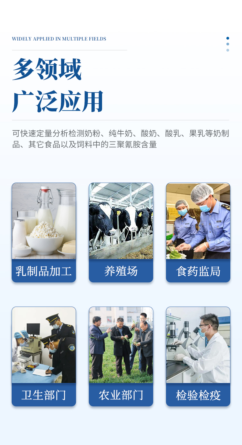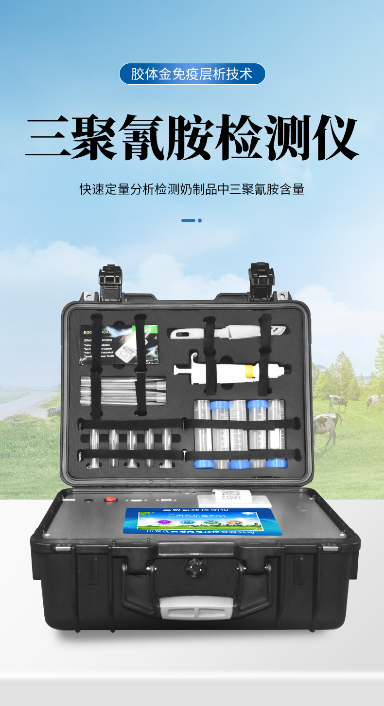 三聚氰胺檢測儀可快速定量分析檢測奶粉、純牛奶、酸奶、酸乳、果乳等奶制品、其它食品以及飼料中的三聚氰胺含量。從原料采購到成品檢驗均可使用,三聚氰胺檢測儀廣泛應用于乳制品加工、養殖場、食藥監局、衛生部門、農業部門、檢驗檢疫等部門使用。