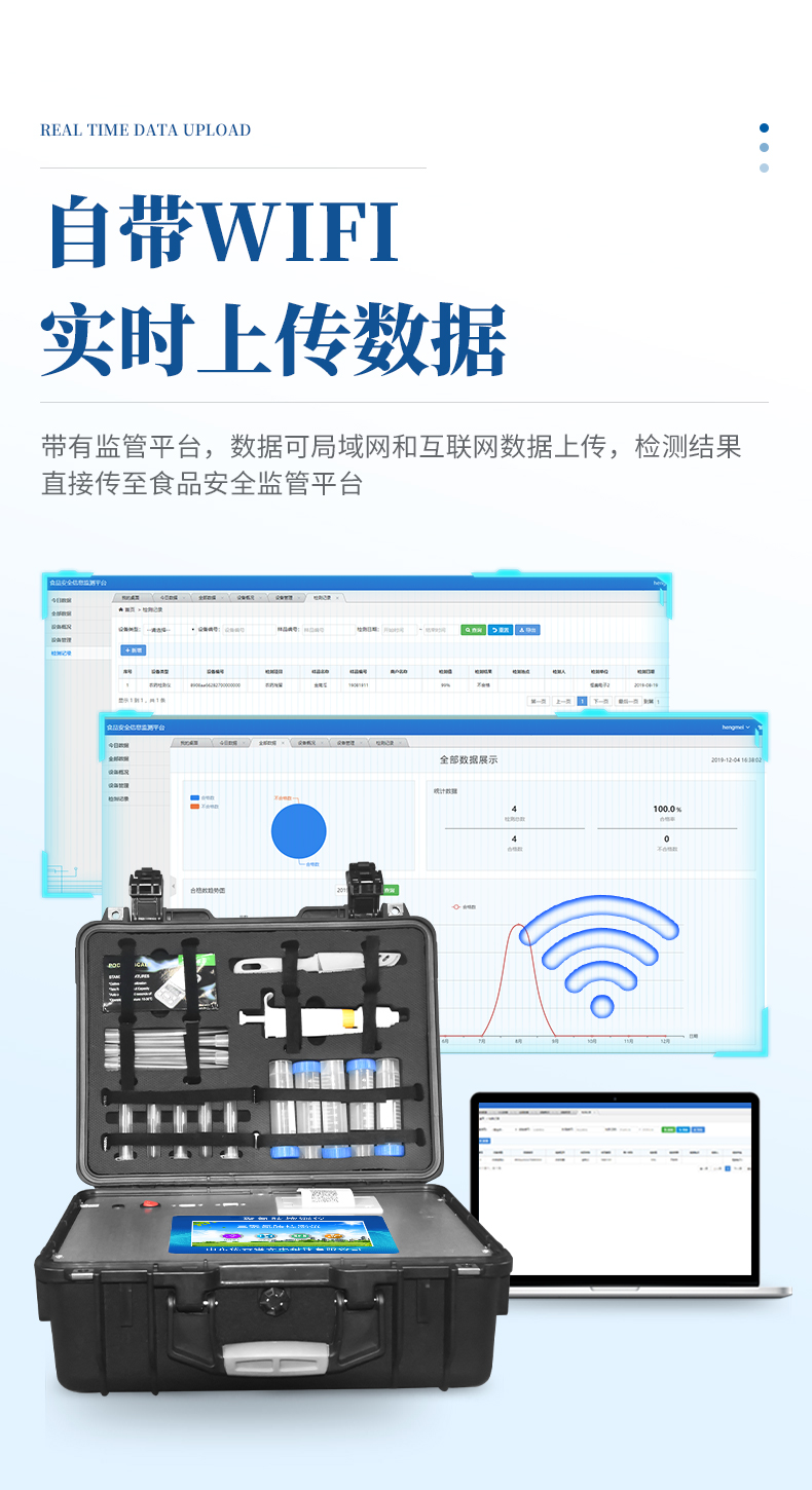 4、儀器帶有監管平臺,數據可局域網和互聯網數據上傳,檢測結果直接傳至食品安全監管平臺。進行區域食品安全監管及大數據分析處理與數據統計,檢測區域食品安全長短期動態,達到食品安全問題預估、預警