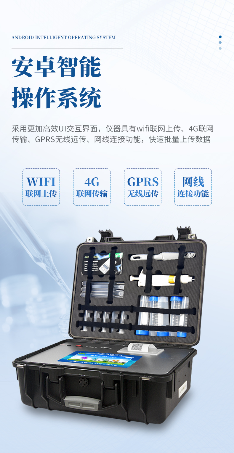 1、安卓智能操作系統,采用更加高效和人性化操作,儀器具有wifi聯網上傳、4G聯網傳輸、GPRS無線遠傳、網線連接功能,快速上傳數據。